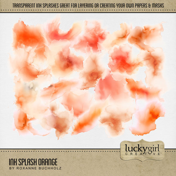 Create your own beautiful watercolor backgrounds with these semi-transparent ink splash overlays by Lucky Girl Creative digital art. Simply add one or more of these overlays to a background paper of your choice to create a one-of-a-kind digital scrapbooking page. Great for any theme or occasion! This kit is included in the Ink Splash Mega Bundle.