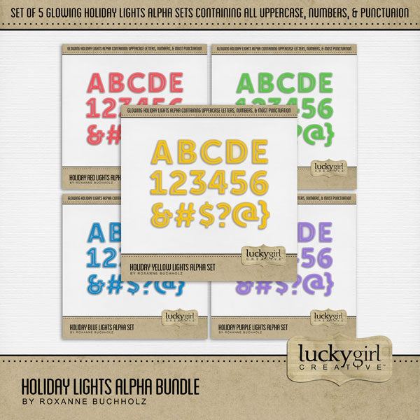 Shine bright this holiday season with these glowing light alpha sets available in blue, green, purple, red, and yellow. Use in a solid color or mix-and-match all the various holiday light alphas for added fun on all your digital scrapbooking page titles! Great for birthday and celebrations, too!