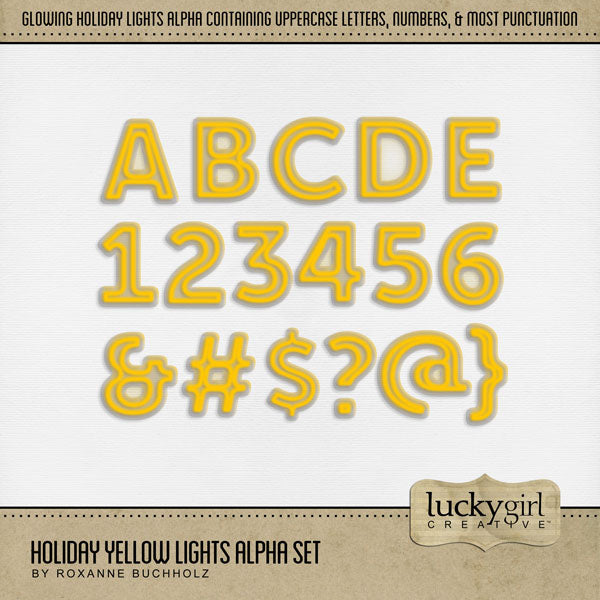 Shine bright this holiday season with this glowing light alpha set by Lucky Girl Creative digital art. Use in a solid color or mix-and-match all the various holiday light alphas for added fun on all your digital scrapbooking page titles! Great for birthday and celebrations! This alpha set consists of a full set of digital art uppercase letters A-Z, numbers 0-9, and most punctuation marks. This alpha set is available as individual embellishments only. This kit is included in the Holiday Lights Alpha Bundle.