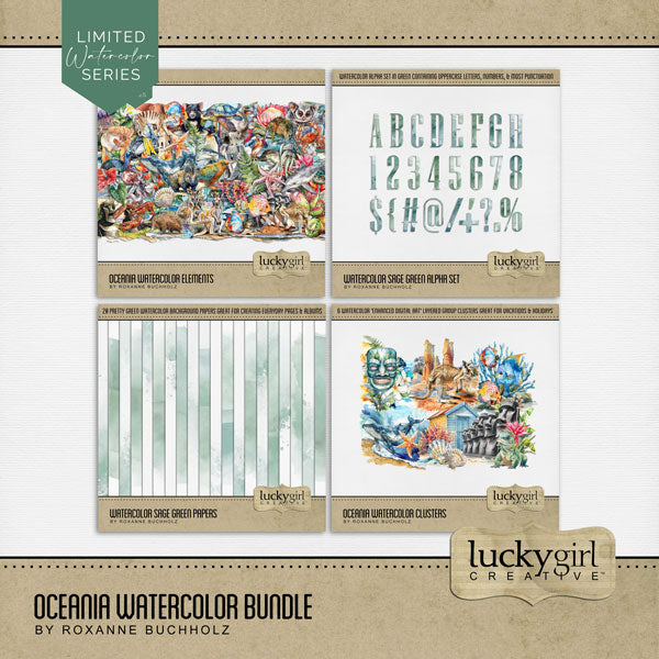 Add these beautiful watercolor embellishments, clusters, papers, and a coordinated alpha set by Lucky Girl Creative digital art to all your digital scrapbooking pages to easily create memorable Oceania pages and albums! Great for vacations to Australia, New Zealand, Fiji, Samoa, Micronesia, and many islands found in the Pacific ocean. Embellishments feature birds, fish, Cassowary, Cockatoo Emu, Kea, Kingfisher, Kiwi, Bushbaby, and more.