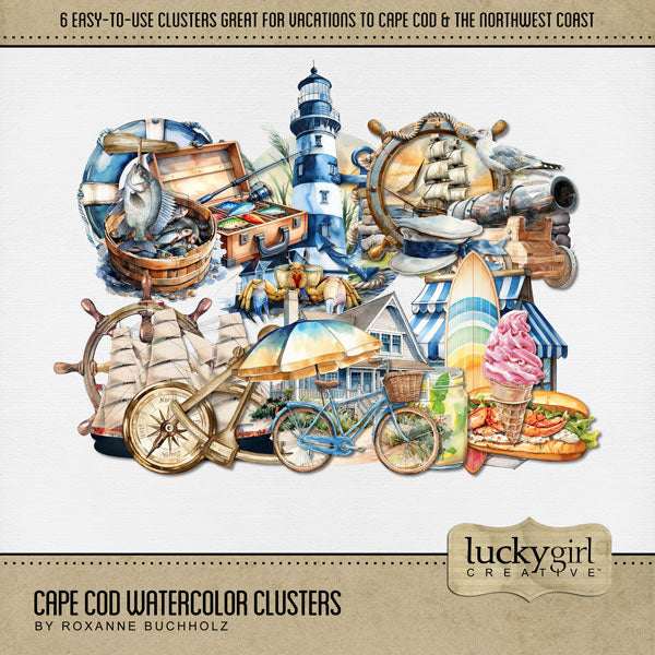 Add these beautiful and easy-to-use watercolor clusters by Lucky Girl Creative digital art to all your digital scrapbooking pages. Great for Cape Cod, coastal Maine, New England, Rhode Island, Outer Banks, North Carolina, Massachusetts South Coast pages, and other beach locations. Simply drop the pre-designed cluster onto your page and go! Embellishment clusters include vintage clipper ship, ship's wheel, compass, fishing rod, tackle box, beach house, lighthouse, bicycle, beach umbrella, fanon, ice cream.