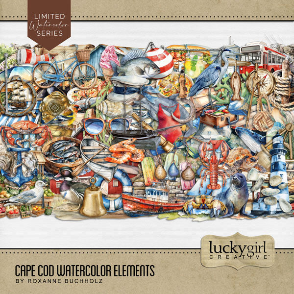 Add these beautiful watercolor nautical embellishments, papers, cluster embellishments, stamps, and alpha set by Lucky Girl Creative to all your digital scrapbooking pages. Great for Cape Cod, coastal Maine, New England, Rhode Island, Outer Banks, North Carolina, Massachusetts South Coast pages, Nantucket, Martha's Vineyard, and other beach and seaside locations. From whale watching and biking the coastal Cape Cod Rail Trail to historical museums and ocean dining, this collection has it all.