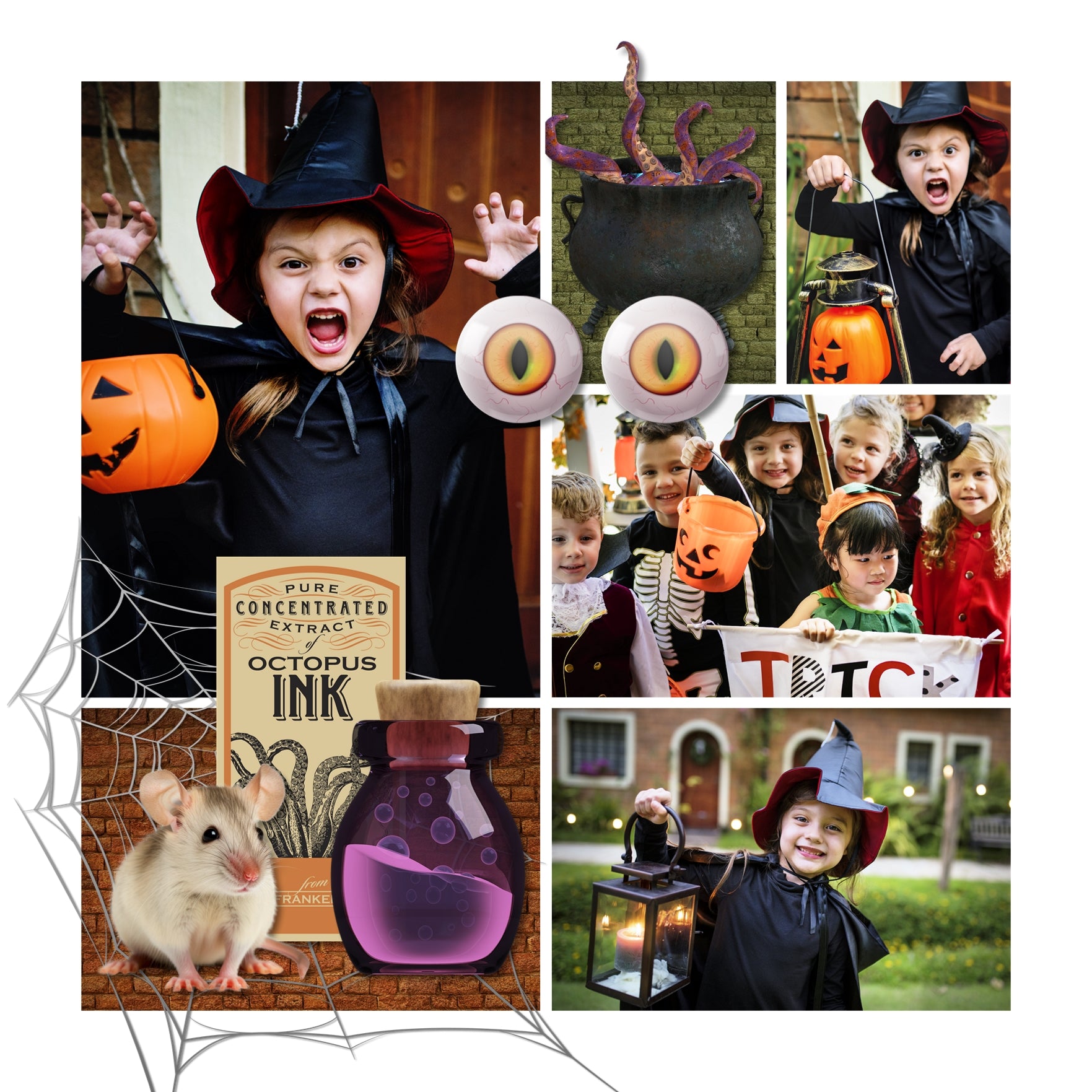 Embellishments include alchemy cards, bats, crow, raven, owl, frog, snail, spider, rat, mouse, skeletons, book of magic spells, antique books, candles, cauldron, tombstone, gravestone, crystal ball, crystals, gems, eyeballs, feather, black ghost cloak, eyeglasses, gate, witch hat, haunted tree, herbs, mushrooms, pen, ink, quill, lantern, magic wands, mortar and pestle, octopus tentacles, flying papers, magic potion bottles, poison labels, apothecary bottle labels, pumpkins, shelves, spider webs, tarot cards, time travel portal, torches, and more!