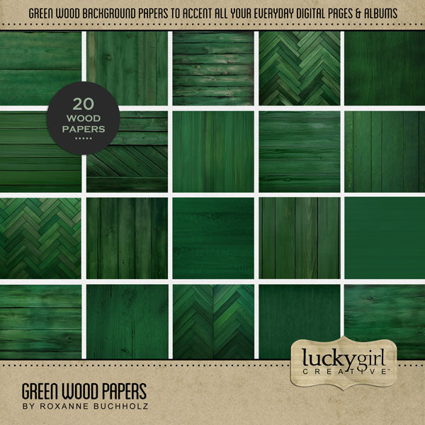 Accent your Christmas greeting cards and traditional seasonal pages with these green wood grain papers by Lucky Girl Creative Digital Art for Digital Scrapbooking. Great for Christmas, festive parties, holiday greeting cards, St. Patrick's Day, and more! This kit is included in the Christmas Season Papers Bundle.