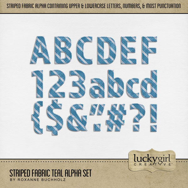 These striped fabric alphabet and number digital scrapbooking embellishments by Lucky Girl Creative digital art are easy to use for everyday digital scrapbook page titles. Use for documenting sewing projects, school and children themes, and summer fun! The Striped Fabric Teal Alpha Set consists of a full set of digital art uppercase alphabet letters A-Z, lowercase alphabet letters a-z, numbers 0-9, and most punctuation marks. This alpha set is available as individual embellishments only.