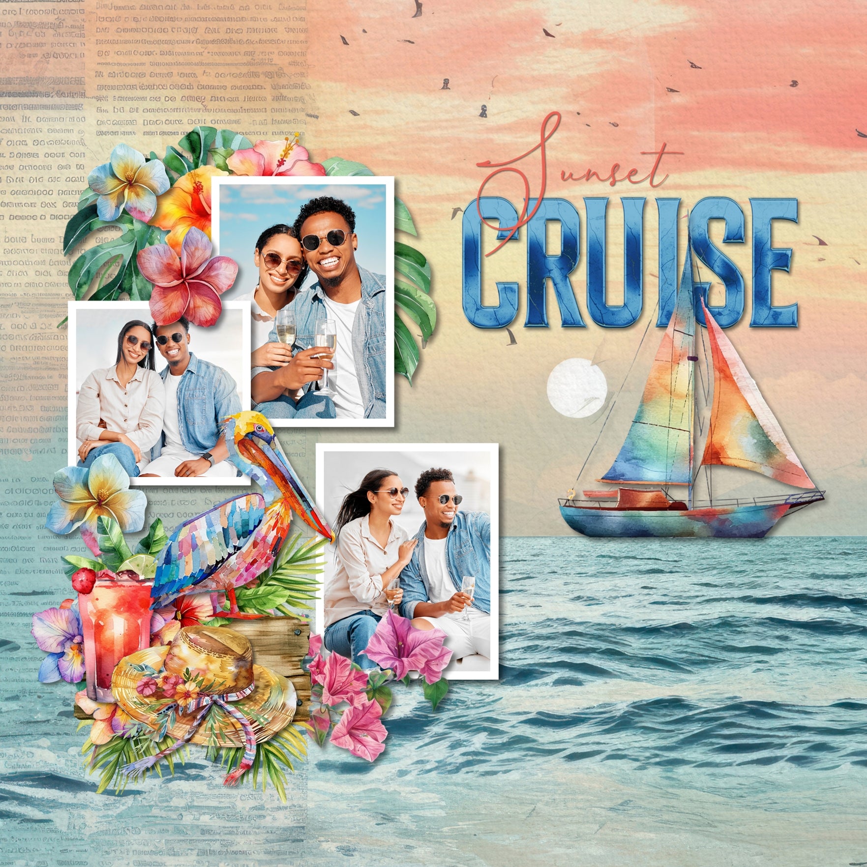 These beautiful ocean papers are the perfect addition to your vacation, beach, and ocean adventures. Great for holidays to Hawaii, the Caribbean, Florida, California, the Outer Banks, and New England. Each paper is designed using layers of mixed media elements in a junk journal style of newspaper bits, paint, torn paper, and photographs. Images include beach, sea, ocean, coast, palm trees, flowers, sunset, island, waves, and more.