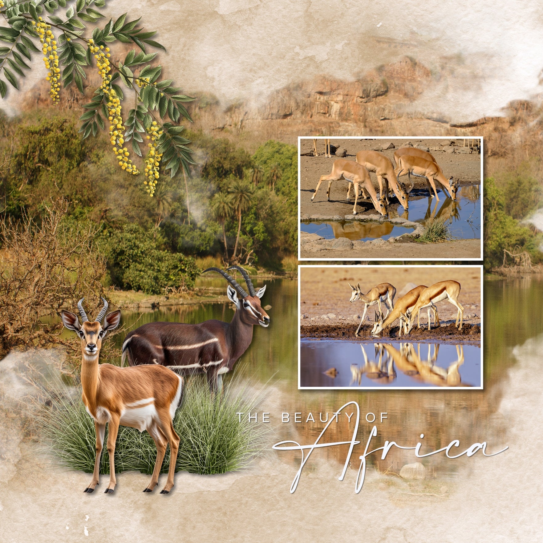 Be inspired by the beautiful savanna with these realistic digital scrapbooking embellishments, natural papers, masked overlays, landscapes, and alpha sets. Perfect for accenting your favorite vacation photos of Africa, Australia, the desert, the prairie, and the grasslands.