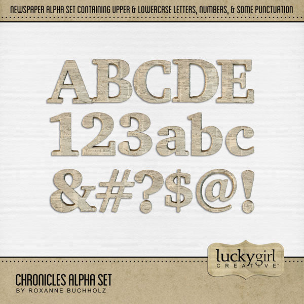 These vintage newspaper alphabet and number digital scrapbooking embellishments by Lucky Girl Creative digital art are easy to use for everyday digital scrapbook page titles. Use for documenting family history, genealogy projects, and more. The Chronicles Alpha Set consists of a full set of digital art uppercase alphabet letters A-Z, numbers 0-9, and some punctuation marks. This alpha set is available as individual embellishments only. This kit is included in the Christmas Chronicles Bundle.