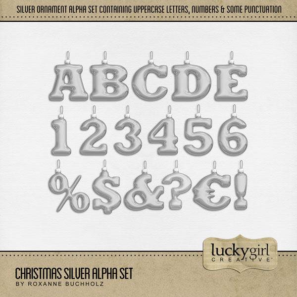 Celebrate the holidays with this beautiful silver ornament alpha set by Lucky Girl Creative. These digital art embellishments are great for all your Christmas projects! The Christmas Silver Alpha Set consists of a full set of digital art uppercase letters A-Z, numbers 0-9, and some punctuation marks. This alpha set is available as individual embellishments only.