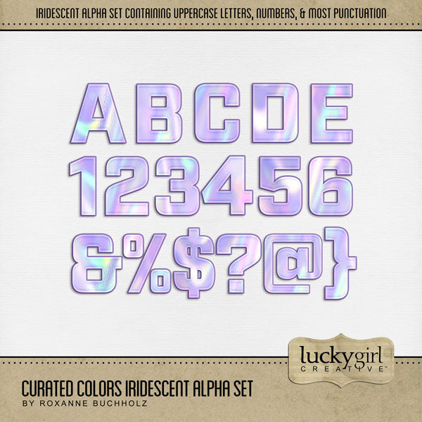 The Curated Colors Iridescent Alpha Set consists of a full set of digital art uppercase alphabet letters A-Z, numbers 0-9, and most punctuation marks. This alpha set is available as individual embellishments only.