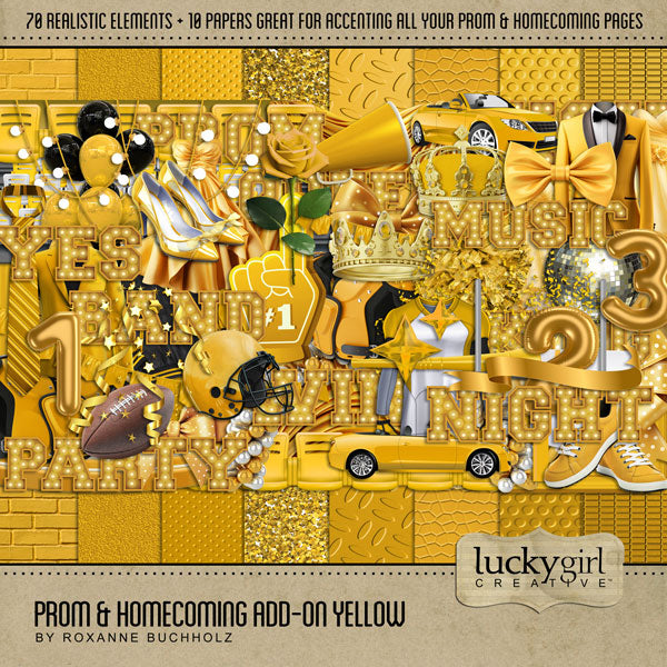 Have fun recalling the memories of your high school prom and homecoming with these realistic digital scrapbooking embellishments. Great for school dances, prom, HOCO, football games, parties, and homecoming celebrations, too! If your school colors include yellow, pair this collection with the Prom & Homecoming Bundle, and you'll be ready to show off your school spirit!